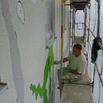 In der Regel wird ein Gerüst gestellt, die Fassade gereinigt und anschließend weiß grundiert. Daraufhin male ich die schwarzen Konturenlinien frei- Hand 1:1 nach dem Entwurf mit dem Pinsel auf die Fassade oder das Objekt auf.