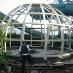 Damit der Turm eine außergewöhnliche Optik bekommt und als Wahrzeichen des Bades fungieren kann, habe ich mich für eine riesige, bunt bemalte Kuppel mit Bommeln anstatt des herkömmlichen Turmaufbaus entschieden. Die Idee für die Formgebung und die runden Bullaugenfenster ist entstanden, als ich mir überlegt hatte, eine Art riesigen Tintenfisch neben dem Bad zu platzieren, der in Form der knallbunten Rutschenröhren seine geschlängelten, langen Arme ausbreitet. Dazu musste der alte Aufbau oben von dem Turmschaft abgetrennt werden und mit einem Autokran heruntergehoben werden. Zuvor wurde auf dem Boden neben dem Miramar auf einer gegossenen Betonplatte die neue GFK- Kuppel gefertigt und bemalt. Diese ist aus mehreren Kunststoffteilen gefertigt und am Ende mit dem Autokran über eine hinterlüftete Dachstuhlkonstruktion auf die Betonplatte gesetzt und verschraubt worden.